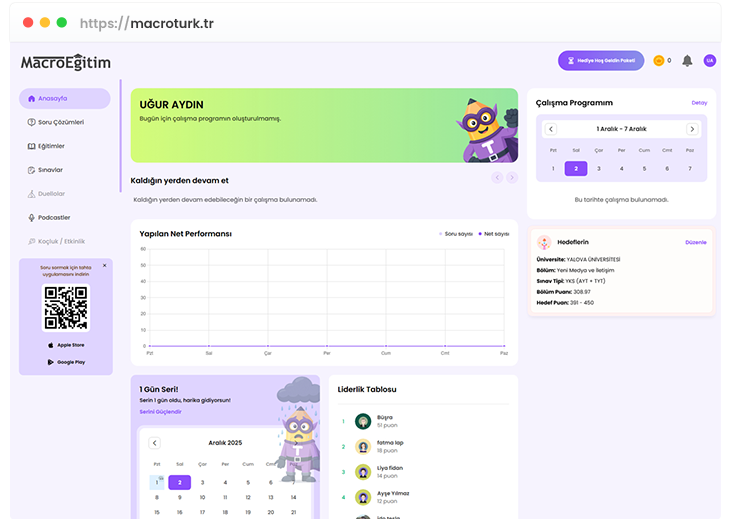 MacroEğitim, yapay zekâ destekli soru çözüm sistemi ve kişisel çalışma programıyla binlerce öğrencinin başarı yolculuğunu hızlandırıyor. Artan kullanıcı sayısı ve yüksek memnuniyet oranı ile büyümeye devam ediyor.